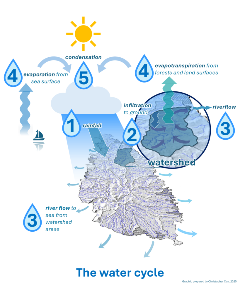 Over non-vegetated areas, water that settles on the surface is quickly evaporated to the atmosphere by incoming solar energy. Of the water that is retained within the landscape, a portion infiltrates into the deeper layers of the soil and bedrock where it contributes to groundwater storage, while the remainder traverses through the upper layers of the soil and bedrock (sub-surface flow), and over the soil surface, to enter streams and rivers generally as surface flow or river flow. This water eventually finds its way to the sea. The graphic illustrates the water or ‘hydrological’ cycle typical for a small island like Saint Lucia.