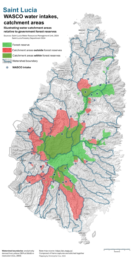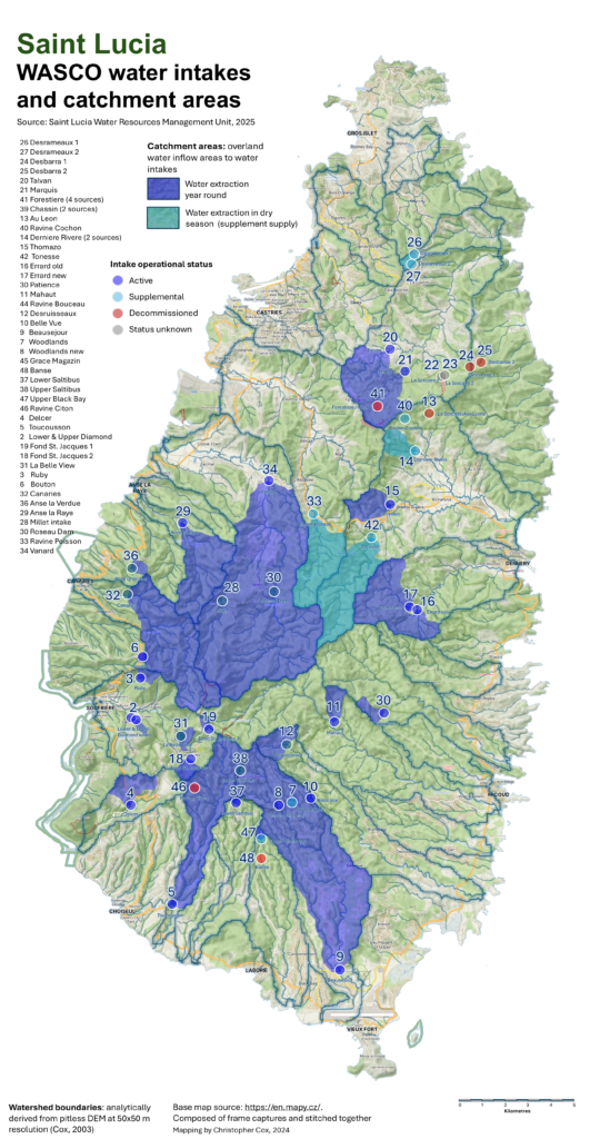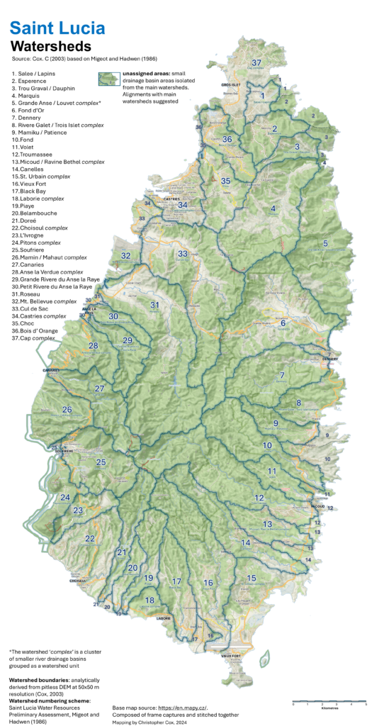Saint Lucia’s 616 km2 landscape, has been divided into 37 main watersheds based on the geography of its river networks (based on work of Migeot, J. & Hadwen, Saint Lucia Water Resources: Preliminary Assessment. Vols. 1 & 2. Ministry of Agriculture, Castries, St. Lucia. 1984).