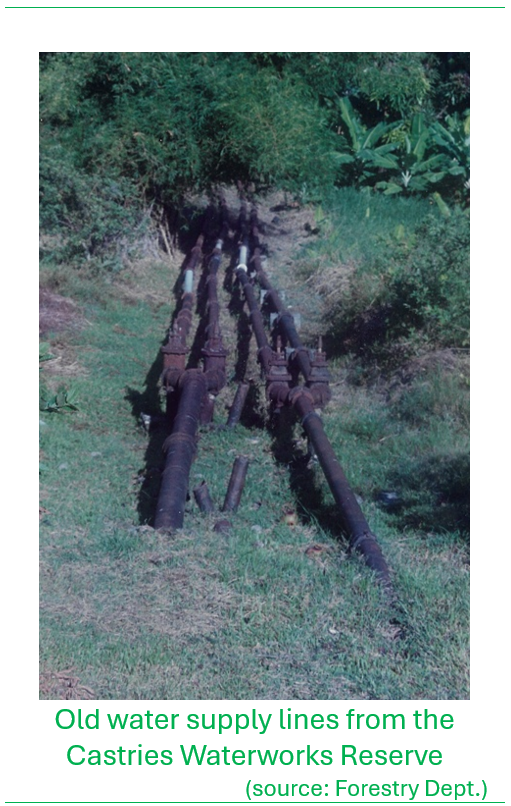 Taking on board recommendations from the Hooper report and to allay the threat deforestation posed to the most important water supply area to the city of Castries, in 1916 the colonial government declared some 1,393 hectares (3,442 acres) of the expansive forests between La Sorciere and Piton Flore (that were on Crown lands) as the Castries Waterworks Reserve, in accordance with Section 4 of the Castries Water Supply Ordinance (Chapter 230) of 1901 relating to designating and protecting ‘Gathering Grounds‘ for water. In those days, small water intakes were established on select forest streams at Des Chassin and at Forestiere, that fed water to the city mainly via gravity.