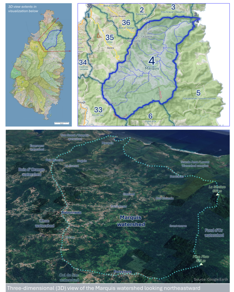 The communities of Forestiere, Cacoa, Babonneau, Paix Bouche and Desbarras, along with the connecting road networks straddle the ridgelines or ‘watershed divides’, that separate the Marquis Watershed from the surrounding watersheds.