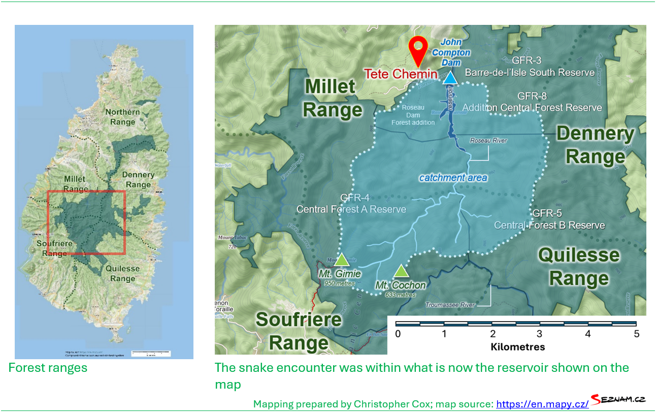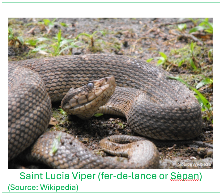 There was a mass of tangled roots on the bank, and just as I reached out to grab the roots to gain a safety hold, a Saint Lucia Fer-de-lance or Saint Lucia Lancehead/Saint Lucia Viper (the highly venomous viper native to Saint Lucia known locally as ‘serpent’) lunged towards me, mouth wide open! God alone knows what happened next…I flung myself backwards in a flash and falling whole-suit in the basen, still clutching my cutlass (machete), my sights focusing on the snake on top of the roots, making an unbelievable second lunge, hitting air as if it could not believe it missed a target that was so close. Had it made its mark I would have been bitten in the chest! I remember the water was cold and my senses at that moment became so acute I could hear a leaf falling a hundred feet away and the songs of all the birds singing at the time….only then I realized how noisy the forest was! If the clarity of my senses had retained that level of acuteness, I would have been a genius!!