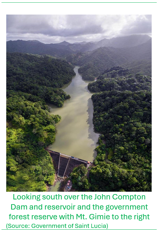 Preamble: The water supply for Saint Lucia is derived from its rivers that originate in the mountainous central forest reserves. As the population in the northern part of the island grew, so did the need for water. To service the demand, a large reservoir along the Roseau River, within the forest reserve near the community of Millet, was commissioned in the mid-1990s. The reservoir was named the John Compton Dam after the then Prime Minister of the country. The island’s forest reserves and adjacent landscapes extending all the way to the coast, are divided into management units called ‘forest ranges and forestry personnel are assigned to these ranges for purposes of monitoring the health of the forests, rivers, and wildlife, and for working with the public in adjacent communities within the geographic extents of each range to help conserve forest and natural resources. The John Compton (Roseau) Dam is located within Millet Range.