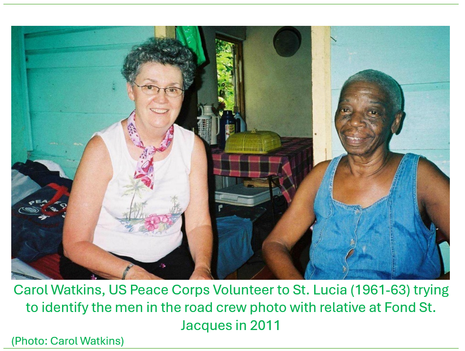 I gave her two pictures — one of the road bouldering crew I had taken in 1961, and another of Lucille (cook), and two workers (Clavence and John – sorry don’t know their last names). Carol took the picture through Fond St.Jacques and asked everyone she met if they recognized anyone in the photo. Apparently there was keen interest in the photo (partly because all the workers were barefoot!) but there was only one person in the image of workers that anyone recognized. He had died 5 years earlier (2001) but his wife was still living there — and they had 5 daughters, one of whom Carol met during her outing. It was a very nice thing for Carol to do and she wrote up a splendid report complete with pictures of lots of folks — including some Forestry employees — looking at the pictures.”