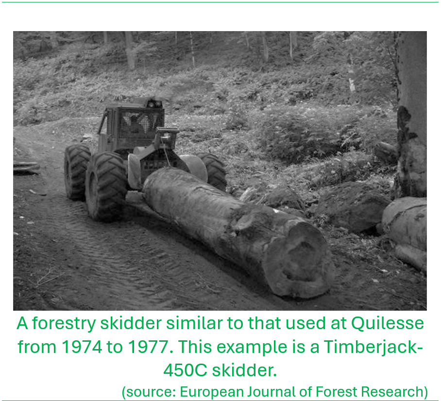 This management plan was used as the basis for the upgrading of commercial forestry operations particularly within the Quilesse Range. Bulldozers were used to cut logging roads into the forest reserve to provide motorized access to the plantations where the trees would be logged on-site, and the logs hauled to a loading bay using a specialized tractor called a skidder. This skidder operated at Quilesse. The loading bay operations on the eastern side of the forest was at La Porte, and on the western side at Edmund Forest. A truck from Timbershed would come twice a week to haul the logs to the sawmill at Conway. David Moore a forester from the UK who worked as Assistant Conservator of Forests in Trinidad & Tobago and deployed to Saint Lucia in the early 1970s, oversaw implementation of the forest management plan and the timber production operations at Quilesse. He was supported by Archibald ‘Archie’ Gajadhar, the senior forestry officer at the time who worked under William Lang. From the 1970s into the 1980s, the range officers with primary operational oversight for the timber operations in the Quilesse Reserve included Felix James, Ananias Verneuil, Michael Bobb, Lawerence Antoine and Emmaneul Theodore.