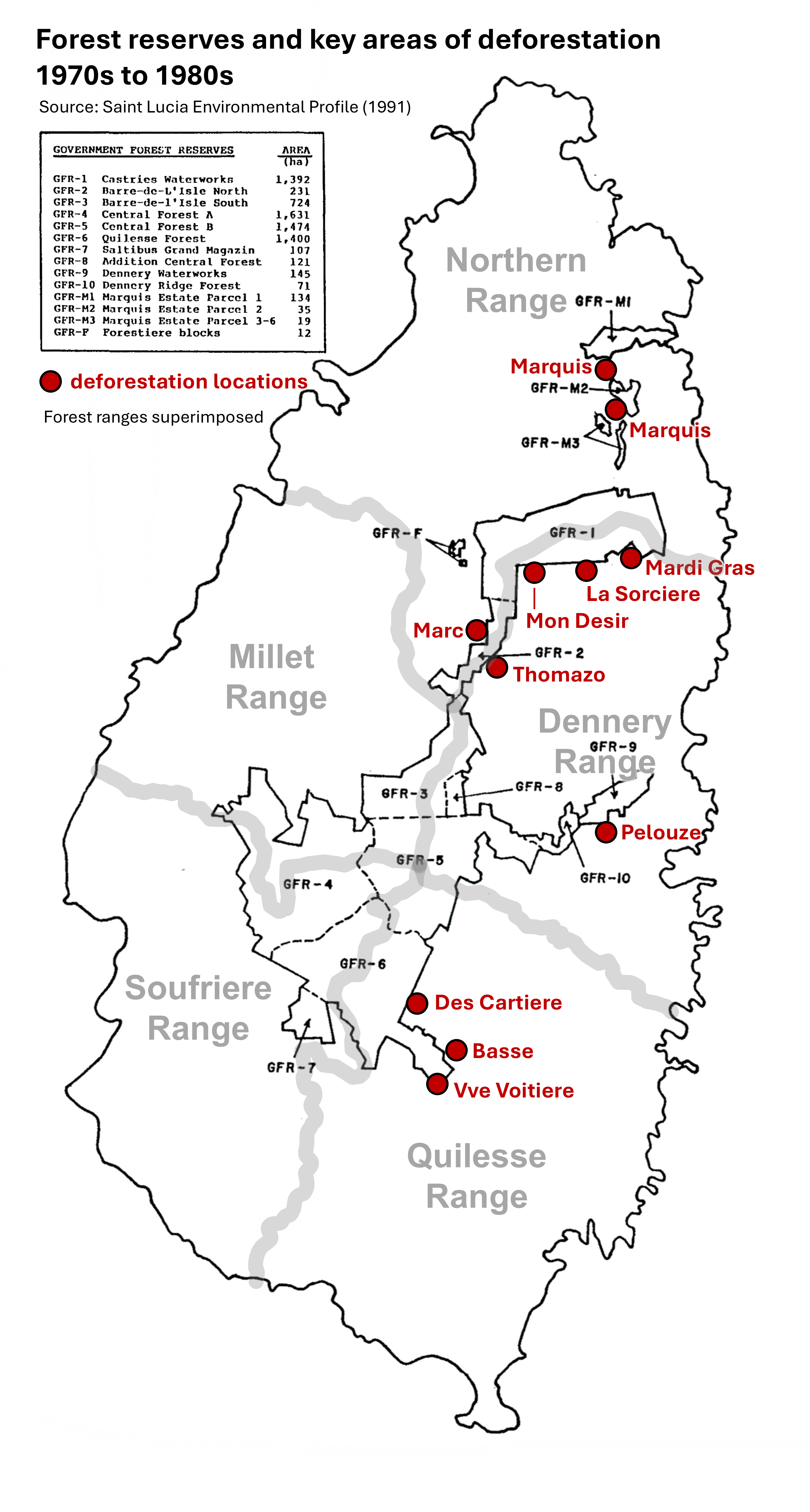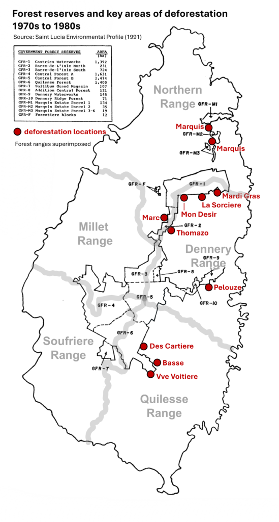 Commencing in 1982 the Government of Canada through the Canadian International Development Agency (CIDA) provided financial and technical assistance to the Government of Saint Lucia under a multi-phased Forest Management and Conservation Project. The project sought to strengthen the capacity of the country to manage its forest resources, recognizing the threats posed by the aggressive rates of deforestation that was plaguing the country, as a result of conversion of lands for banana cultivation and harvesting of wood for timber and fuel. In 1982 a major forest inventory was undertaken by Pat O. Piitz, the silviculture expert under the project. Among the main findings of the inventory included…[ summary of key findings]