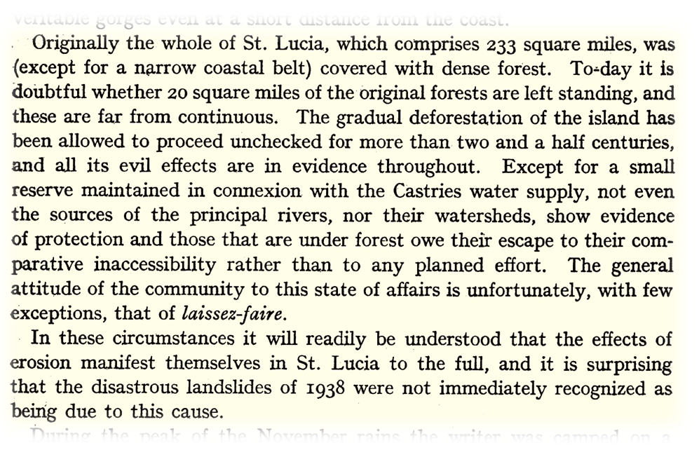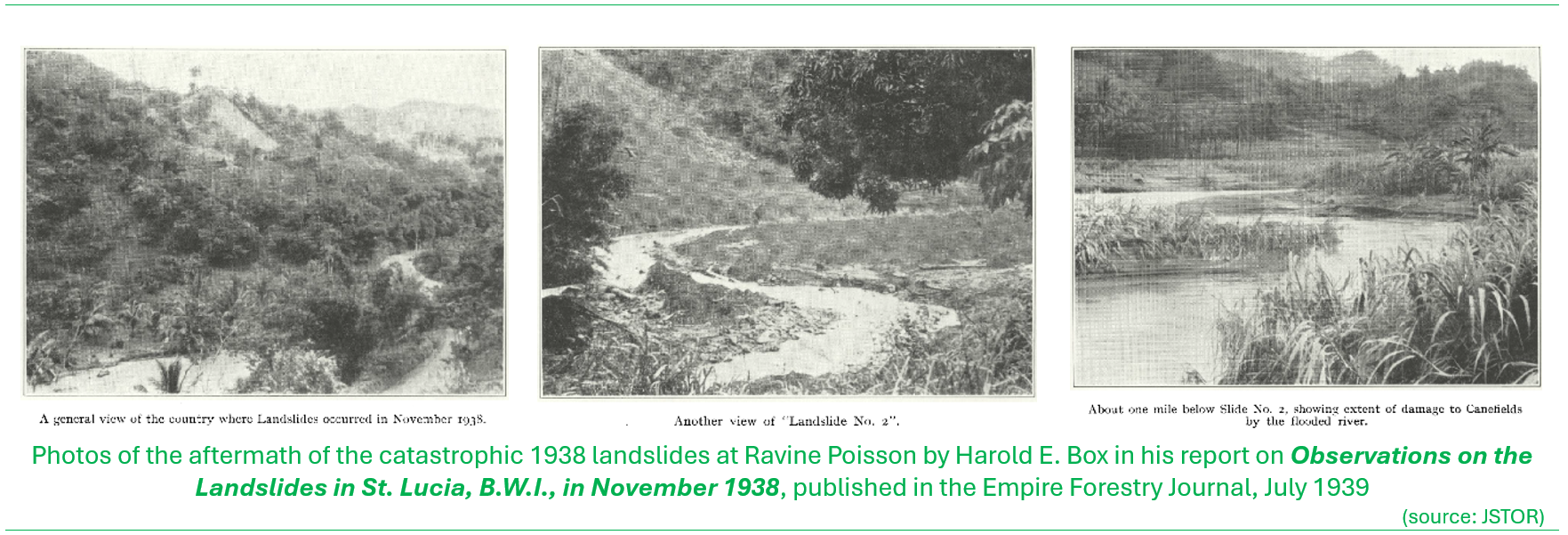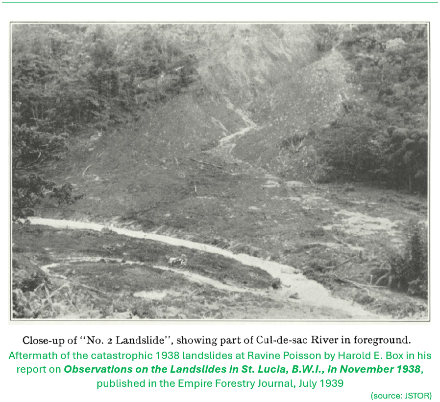 Harold E. Box gave an account of the Ravine Poisson disaster in his article on Observations on the Landslides in St. Lucia, B.W.I., in November 1938, published in the Empire Forestry Journal, July, 1939. He was in Saint Lucia at the time, collecting botanical specimens for the British Museum. Some excerpts of text from his report below, elaborates the circumstances that eventually led to the disaster.