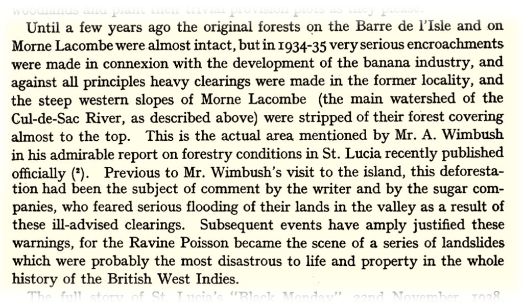 The poignant moment that marked the turn toward action to address forest destruction was with the occurrence of the devastating landslides at Ravine Poisson in November 1938, to be remembered as ‘Black Monday’, where at least 150 people lost their lives. The landslides were triggered by persistent rains over 21-22 November that contributed to already saturated conditions of the soils that underlaid the deforested hillslopes. As far back as 1922, it was documented that hundreds of acres of land along the Barre de l’Isle had been cleared for the cultivation of bananas. In 1928, when Panama Disease wiped out the crop, most of the land was abandoned. Professor Claude W. Wardlaw, a pathologist in banana research, described the area as; “a grass grown, barren waste with roadways overgrown by bush and obliterated by landsides.” (BushTalk Book 1, The Forest). With the loss of the tree cover and the root network that would have stabilized the soil, the unfortunate outcome for the people living in the shadow of the Barre de l’Isle was only a matter of time