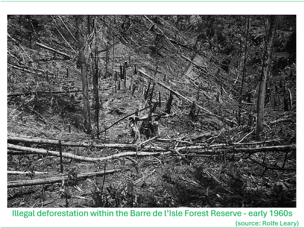 E.Y. Wald, the then Agricultural Superintendent of St. Lucia wrote in the Caribbean Forester in 1939 (Vol. 1, No.1) of the impacts of continued exploitation of the forests ” … the importance [of forests] in soil and moisture conservation, particularly in the vicinity of the headwaters of the principal rivers, cannot be overstated, and it is unfortunate that these points have been appreciated insufficiently in the past.” (source Saint Lucia Environmental Profile, 1991).