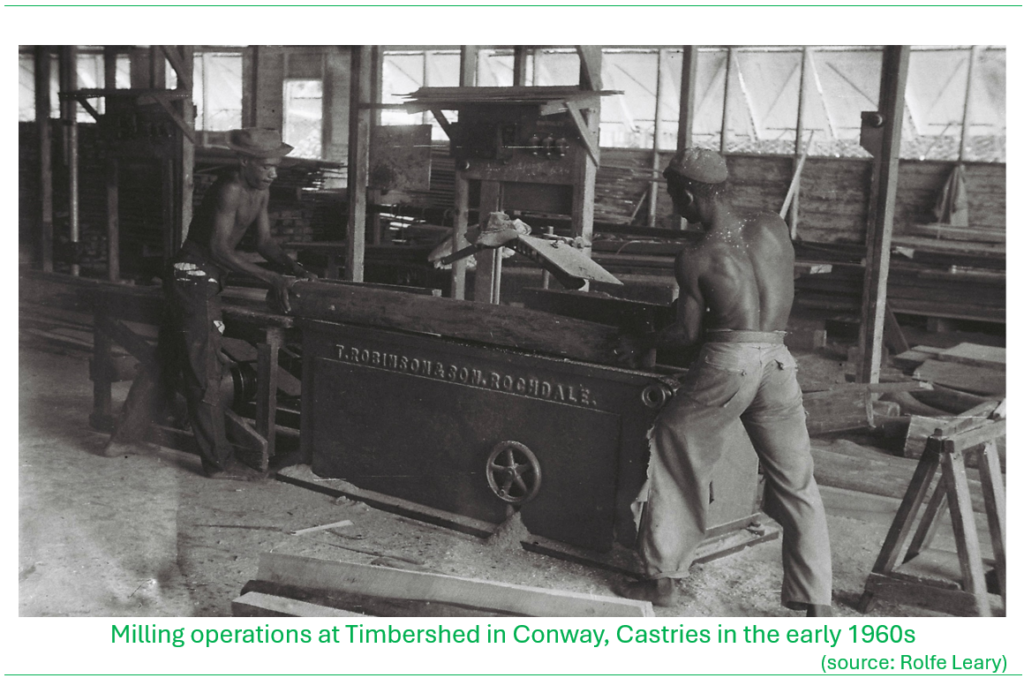 In 1953 a government-supported local timber industry was initiated, designed to encourage landowners to grow and use more local wood and build an economy around commercial forestry. By December 1954 a timber workshop known as Timbershed was established in Conway, Castries and in 1963 the Timber industry Development Board Ordinance was passed to provide for the establishment of a Timber Industry Development Board to provide oversight for sawmilling operations and guidance in commercial timber development in the country. The Board was eventually appointed in 1965.