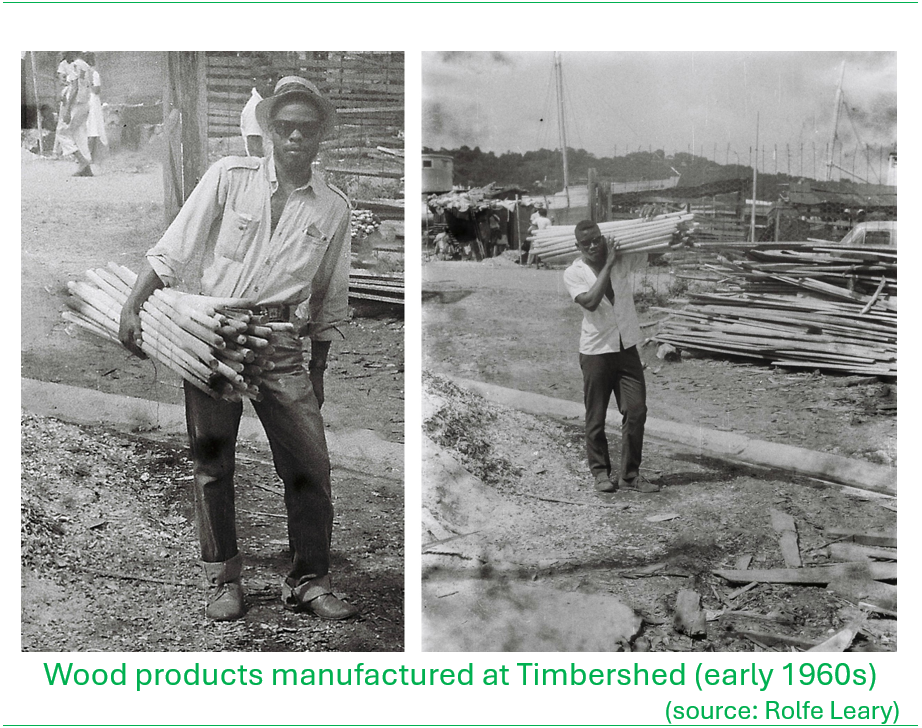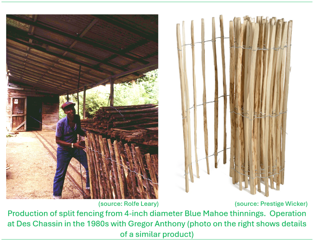 Other forest products were derived from the plantations. A fencepost production facility was set up near the Castries Waterworks Reserve at Des Chassin in the 1950s or 1960s. The fence posts were made from ‘thinnings’, which were usually young Blue Mahoe trees (about 4” diameter) that were selectively removed from plantation forests to reduce crowding and make way for the remaining more vigorous trees in the plantation to mature. Fencing was also made at the facility. They were made from posts that were split into quarters and tied in at set spacing with wire to make the ‘split fencing’ which were sold in rolls.