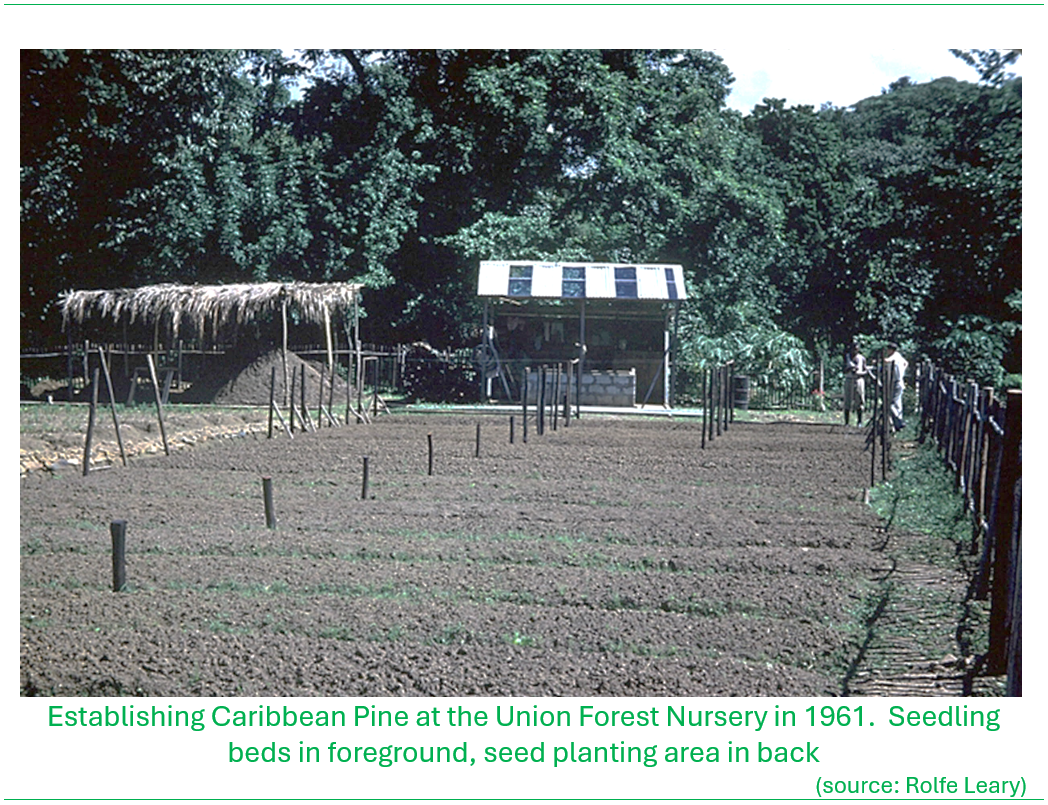 To support the forest planting operations, a dedicated forestry nursery was established at Union, Castries within the Ministry of Agriculture estate (likley in the 1950s into the early 1960s) for the production of seedlings.
