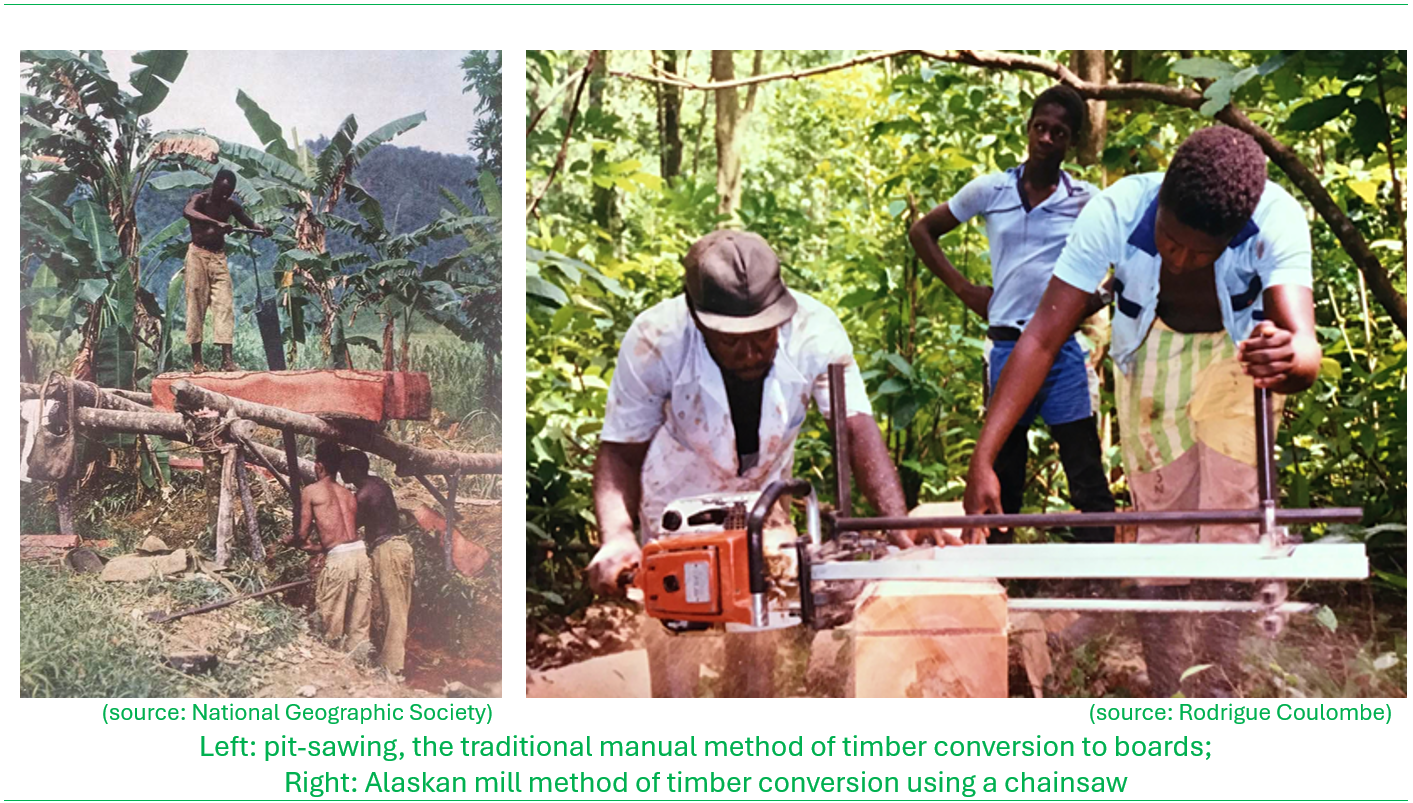 Timber production in Saint Lucia, on account of the terrain, was dominated by small-scale cutting and extraction by selective tree felling. The pit-saw technique was the traditional method employed to convert felled trees to cants (generally a rough squared-off log) and boards. With the availability of chainsaws from the late 1970s, on-site conversion shifted to the Alaskan mill method where the chainsaw would be attached to a metal rig that glided the sawblade in a parallel orientation through the wood, allowing for the sawing of uniform boards.