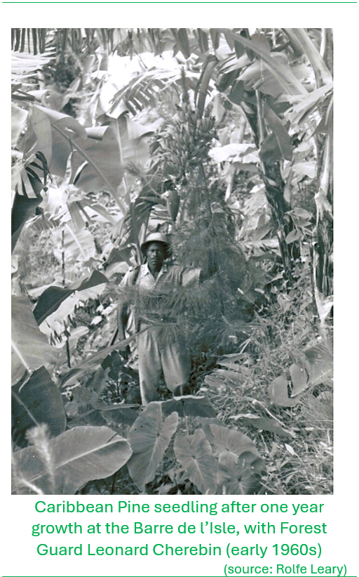 In 1946 William G. Lang a native of Grenada, was appointed as the island’s very first Forest Supervisor by Acting Governor of the Windward Islands, Edward Twinning, to lead efforts toward an organized and formalized forest resources management programme for the country. Under Lang’s leadership, the Forestry Division expanded the areas under protected management under the new forestry ordinance, with the establishment and declaration of the Quilesse Reserve and the Dennery Waterworks Reserve in 1946. This was complementary to the ongoing efforts to plant denuded areas to address the effects of deforestation. This included work on the Barre de l’Isle Ridge were various exotic species of timber trees were planted.