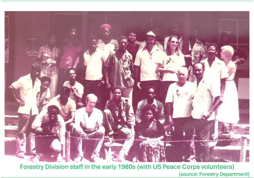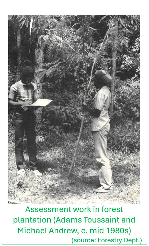 Further studies on forest productivity and timber yields were carried out by Tom Ward, a United States Peace Corps Volunteer to Saint Lucia who established permanent sample plots in the mid-1980s at various locations in the forest reserve to measure growth and predict wood volume yields from Honduras Mahogany plantations. This work was carried forward under the oversight by Michael ‘Jahba’ Andrew, who was assigned at the time to the research portfolio of the Division.
