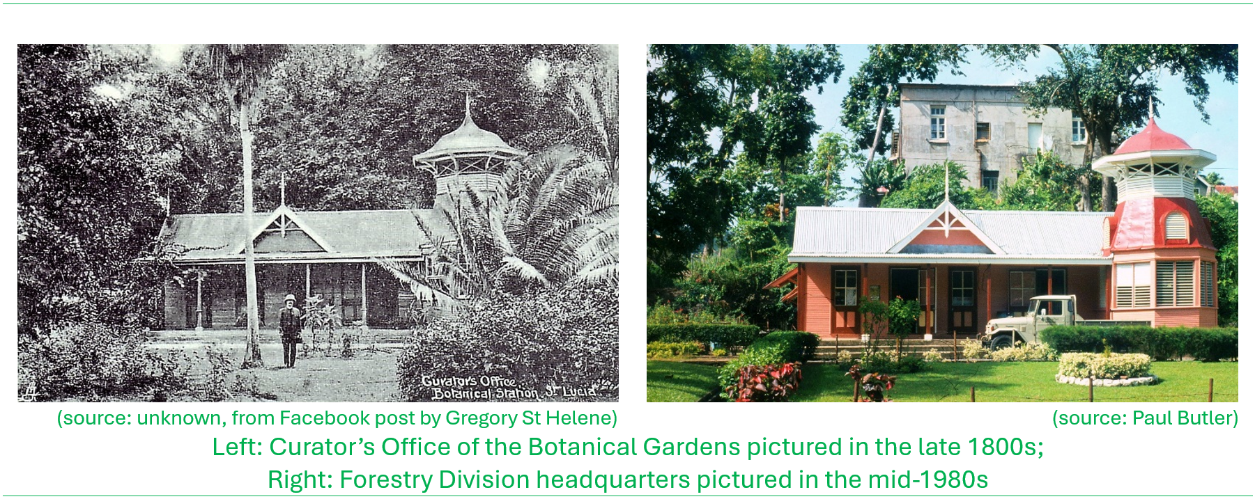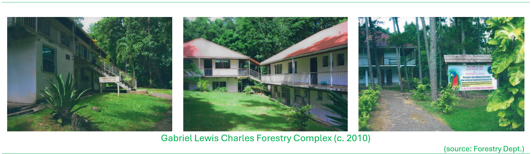 The Forestry Division was initially housed within the Ministry of Agriculture building that was located in downtown Castries on Mongiraud Street (behind the former Lafayette Supermarket). In the mid-1970s the division’s headquarters was relocated to George the V Park, commonly known as the ‘Gardens’ to the gardens Curator’s Office. Under the Canadian (CIDA)-funded forest management project a new headquarters facility was constructed at Union, Castries and completed in 1991. The headquarters was renamed the Gabriel Lewis Charles Forestry Complex in 1993 dedicated to the memory of Gabriel Charles.