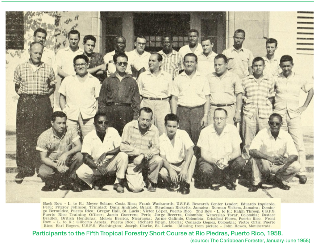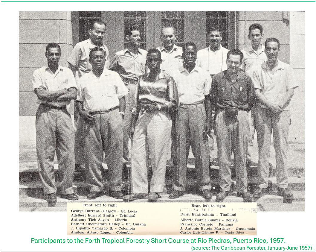 There was also emphasis placed on building up knowledge on forestry and silvicultural practice in order to apply effective decision-making in forest operations. From the 1950s there was ongoing collaborations with the United States Forest Service (USFS) to expose forest officers from Saint Lucia and the wider Caribbean to forestry management principles and practices, based on knowledge gained from work in Puerto Rico by the USFS, but also within the forestry community of the British Commonwealth, where in the Caribbean, Trinidad and Tobago served as the hub for propagation of ‘best-practice’ for the other territories of the British West Indies. Among the ‘early’ Saint Lucian forestry professionals who were sent to training in forestry were George Durrant Glasgow, Joseph Clarke, Gregor Hall and Gabriel Charles.
