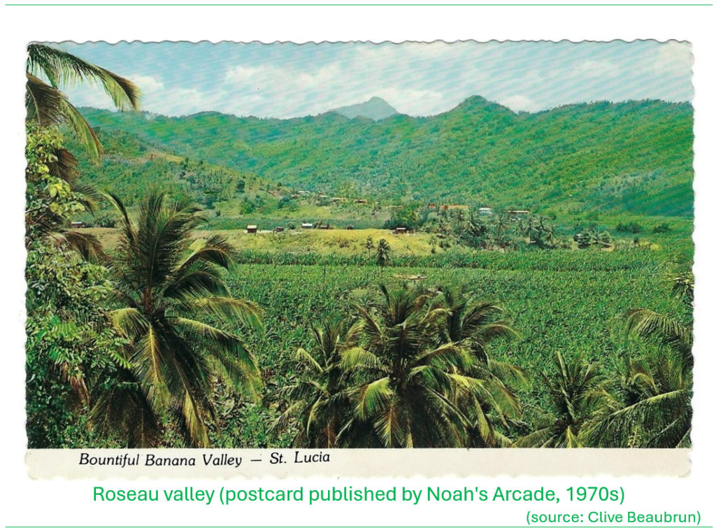 The banana industry saw a rapid expansion from the 1950s that followed the gradual decline and collapse of the sugar industry. Already, banana cultivation was extensive in the island in the early part of the 20th century, but with the ravages of the Panama Disease of the 1920s and 1930s there was a push for establishment of disease-resistant bananas. The investments in the banana industry targeted the large tracts of flat, fertile lands in the Roseau, Cul de Sac and Mabouya valleys. By 1965, bananas accounted for nearly 90 percent of the country’s total exports, making Saint Lucia the first Caribbean economy dependent on the mono-cultivation of bananas (Organization of American States, 1986).