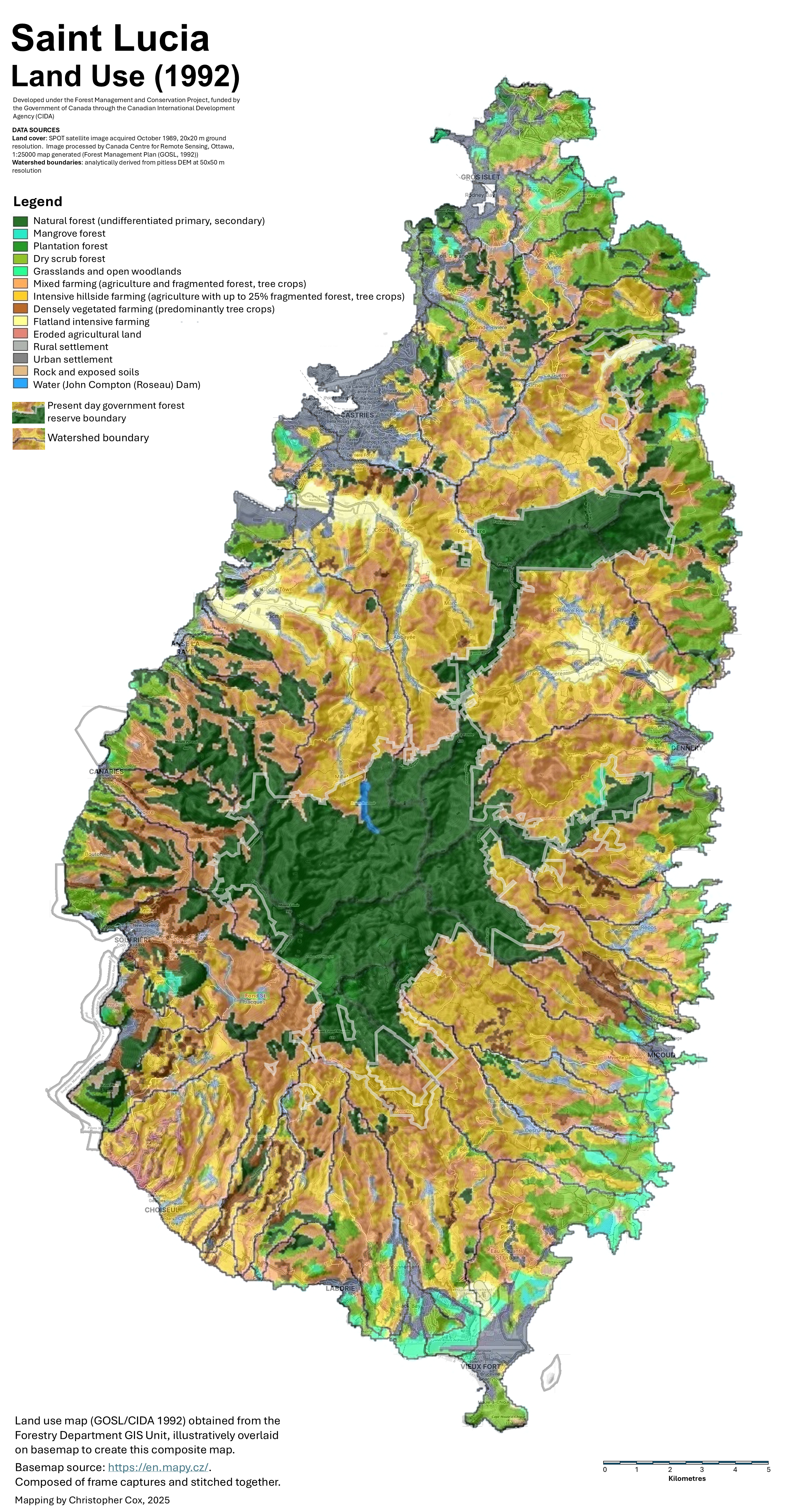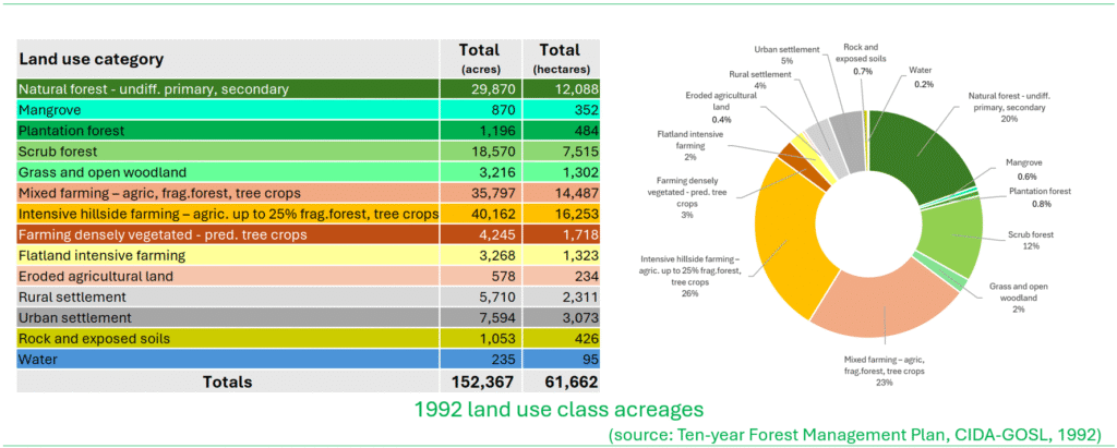 The CIDA forestry project conducted a land use assessment by acquiring satellite imagery and supplementing it with ground-truth observations from 1989 to 1992. This process produced an updated land use map, which was used to determine forest cover on the island for management purposes. The 1992 land use survey revealed that agricultural land use extended in virtually all areas right up to the forest reserve boundaries. The only areas where forests remained relatively intact were in the central western mountains in the upper reaches of the Canaries watershed toward Mt. Parasol where the terrain is excessively steep.