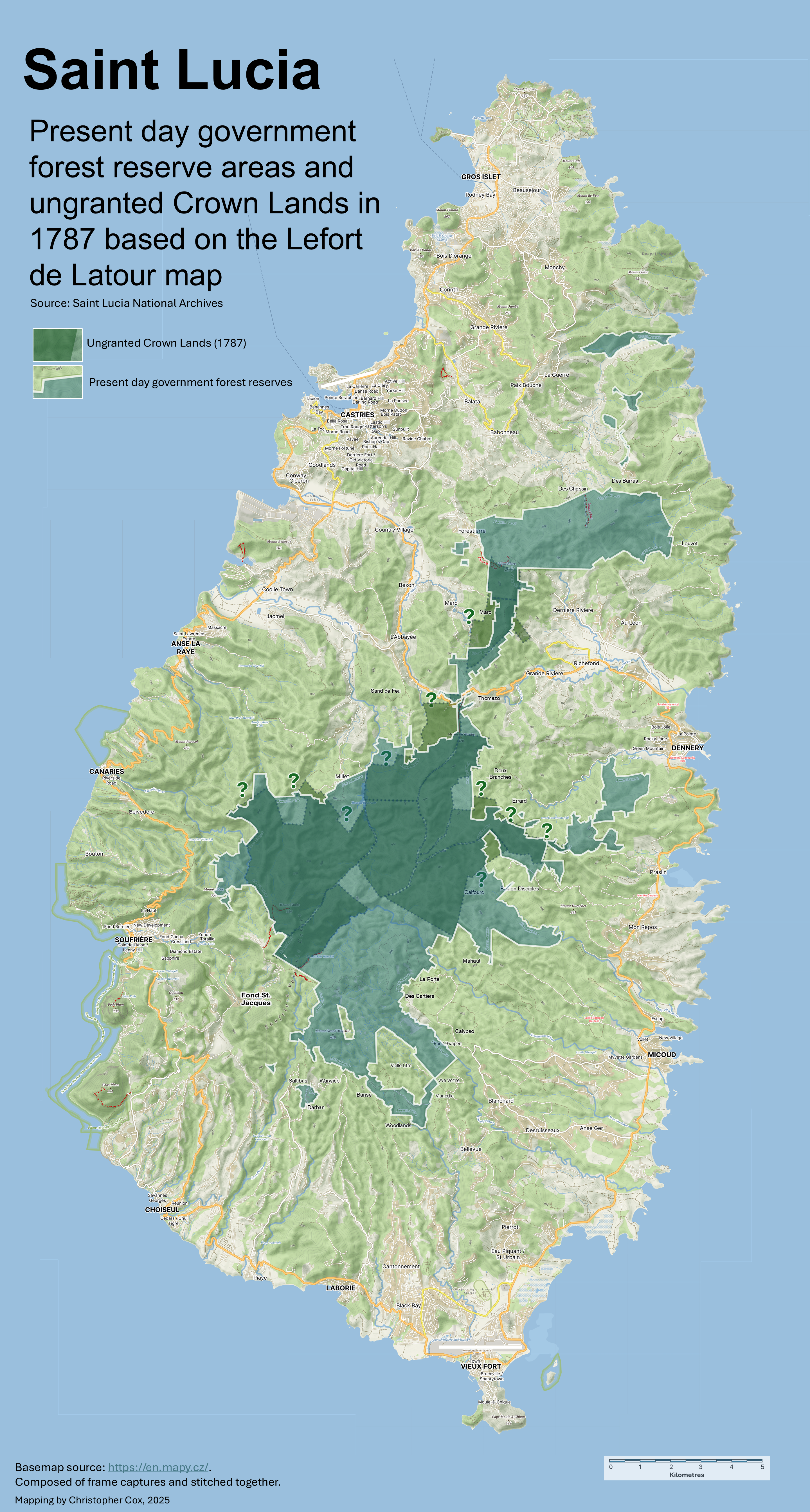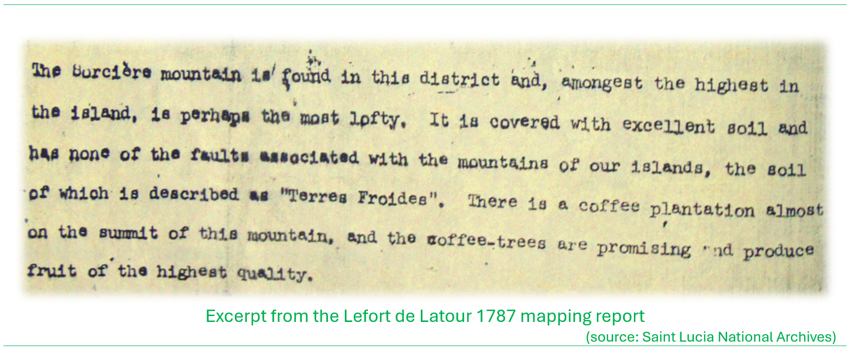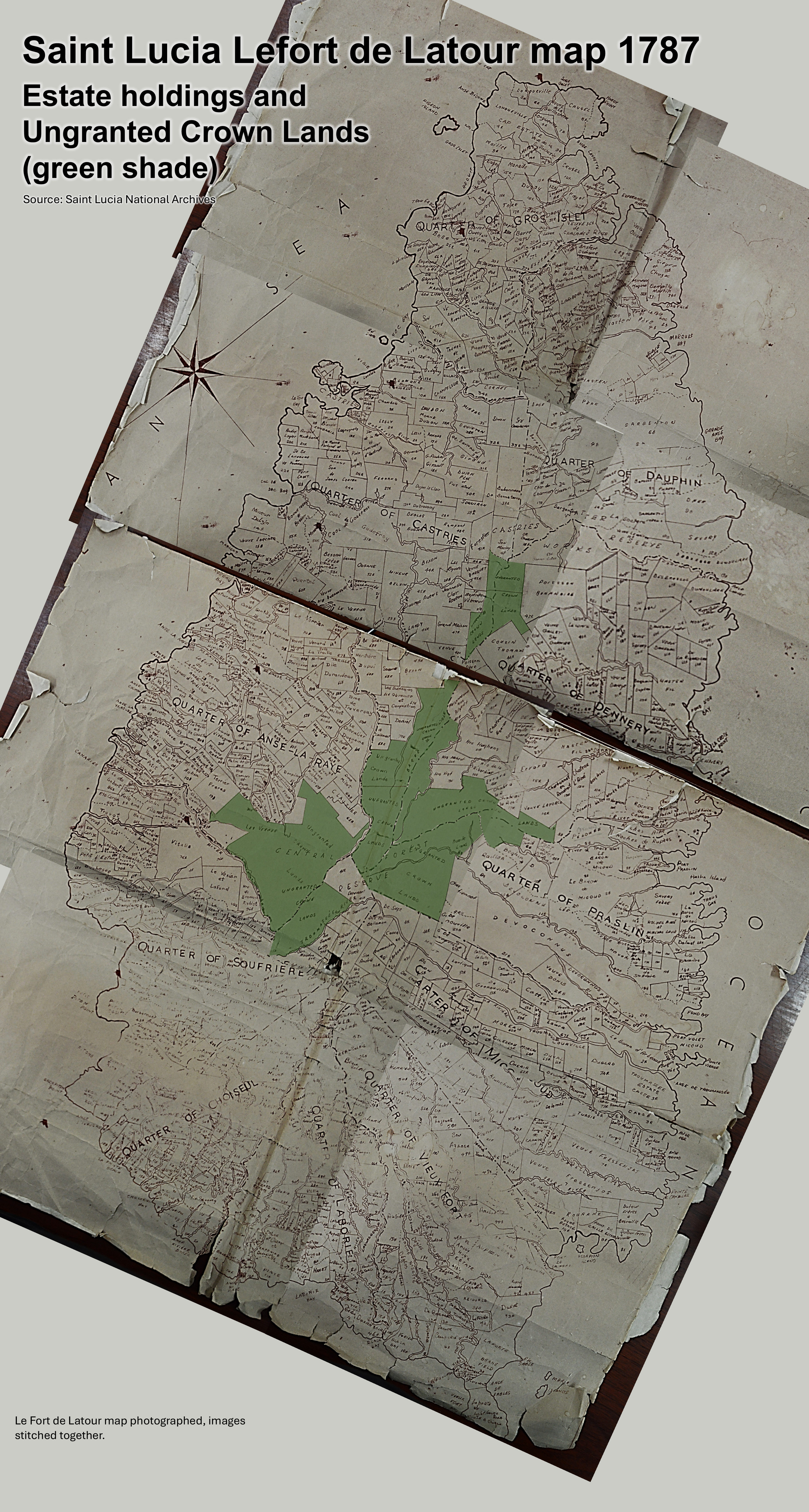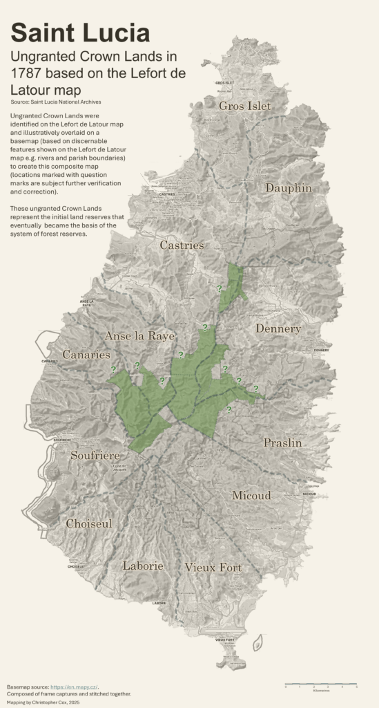 The ‘composite’ map below (traced from an original, held in the Saint Lucia National Archives collections) illustrates the estates as compiled in the 1787 mapping by French surveyor to the King of France, Jean-François Lefort de LaTour with the ungranted Crown Lands in green shade that constituted the beginnings of the core forest reserve areas. It clearly shows that at the time of the survey the vast majority of lands were granted to settlers. Only the most inaccessible interior lands remained ungranted. (note: the delineation of the ungranted Crown Lands was discerned as best as possible, given the quality of the map reproduction; could be improved with a clearer version map).
