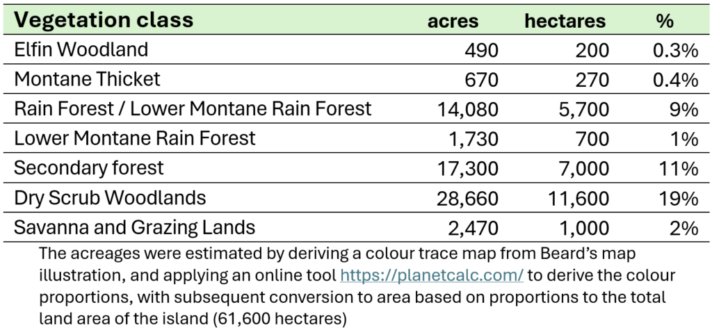 Based on the spatial extents of the vegetation classes Beard illustrated in his mapping, the ‘primary’ or undisturbed forests of the interior, namely elfin woodland, montane thicket, rainforest and lower montane rainforest will have constituted approximately 11% of the total area. Dry scrub woodlands along the coastal areas constituted 19%. Secondary forest constituted 11% of the land area, considered forests that were historically deforested and regenerating.