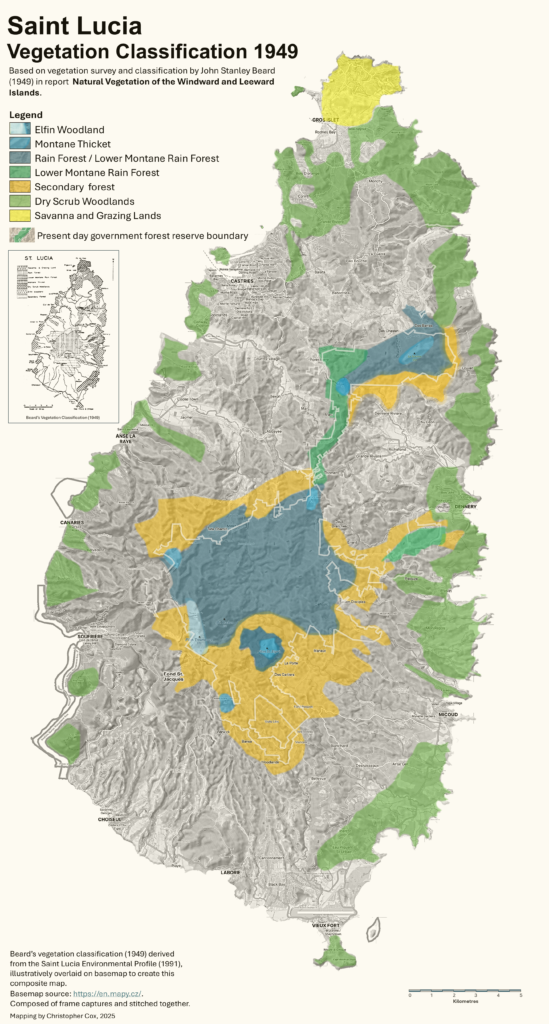 The first attempt to classify the vegetation of Saint Lucia was carried out by Dr. Beard; his work, part of a wider study for the Eastern Caribbean, was published in 1949 in a report titled the Natural Vegetation of the Windward and Leeward Islands. Beard’s vegetation map for Saint Lucia shows large swaths of lands in the interior of the island that were categorized as ‘secondary forest’ (illustrated in orange shade on the map below). Secondary forest or secondary vegetation, generally refers to vegetation that regenerates following disturbance of the original vegetation. In the case of Saint Lucia, such disturbances will have been the result of generations of land clearing for agriculture, timber and fuelwood extraction, whereby the original forests, save for the most remote and inaccessible, will have been felled at some time or other. Indeed, in the narrative of the Lefort de Latour mapping of 1787, it was noted that coffee was being cultivated at La Sorciere near its summit indicating the extent to which the original forests may have been modified.