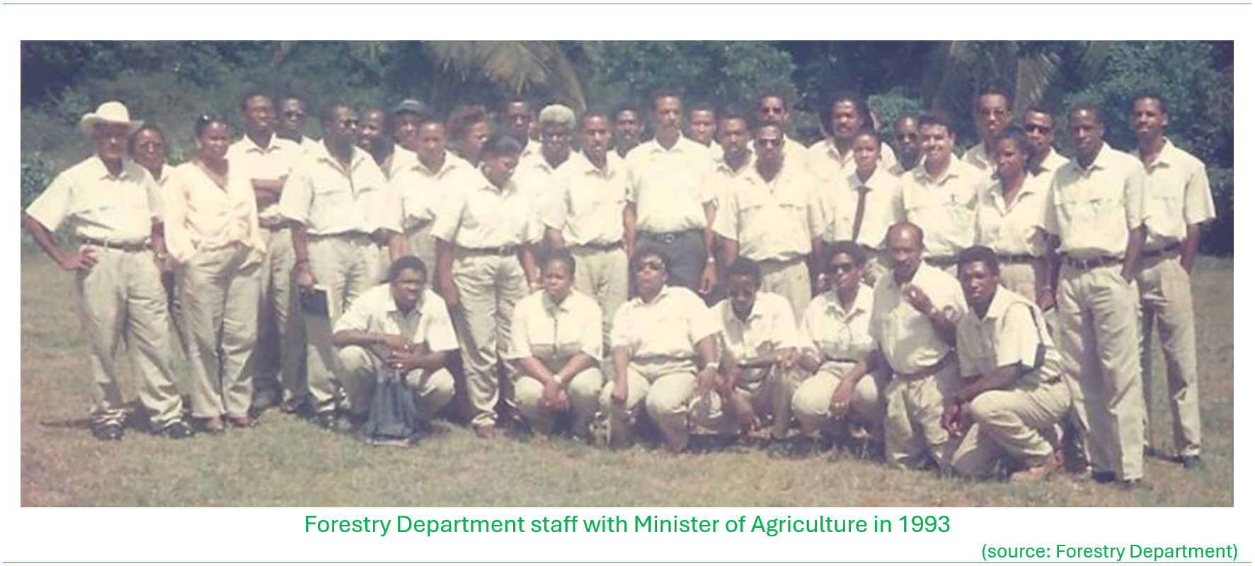 In the years since the establishment of the Forestry Division, its technical and enforcement capability was gradually enhanced with the employment of a team of forestry officers and forest guards. Given the challenges associated with combating illegal forest clearing on Crown Lands and forest reserves, patrolling by foot in remote areas was routine. Forestry officers and forest guards were known locally as ‘police bwa’ and it was customary that select officers were issued firearms for protection.