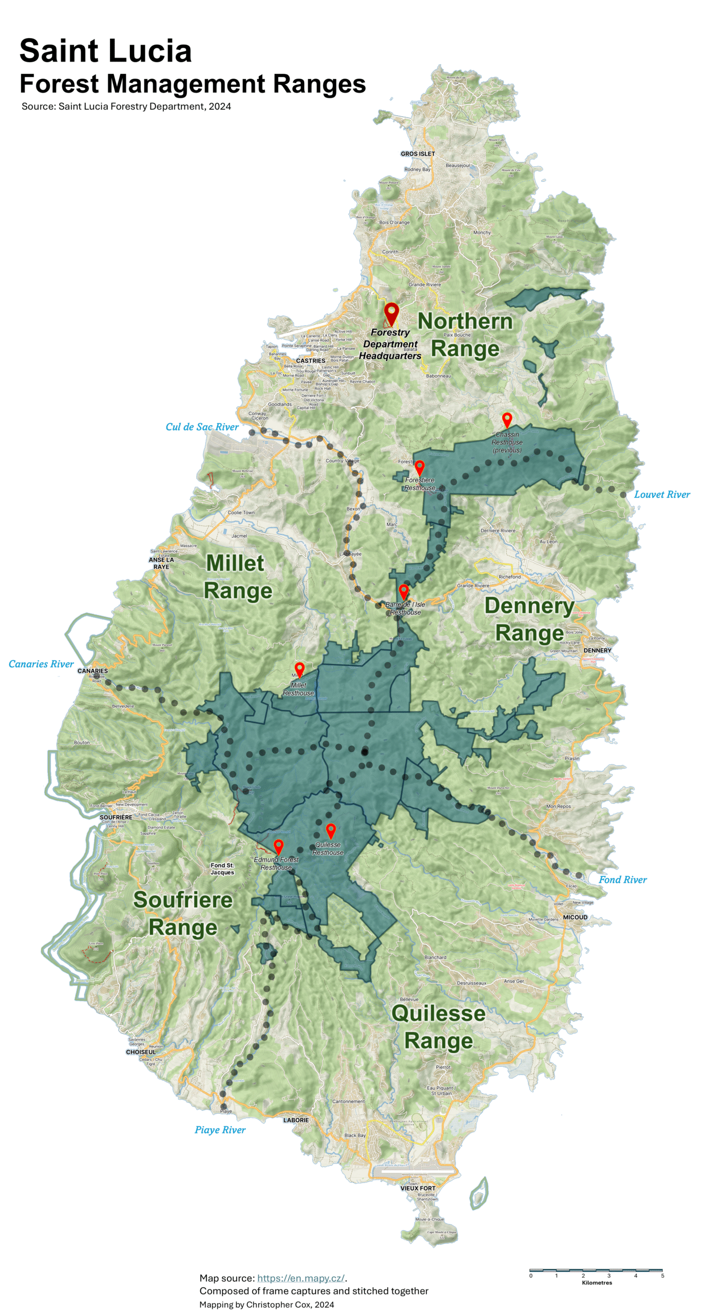 Saint Lucia is divided into five ‘area-equivalent’ regions or ranges over which forestry operations and engagement with the public would be carried out. The range areas were not only confined to within the government forest reserves but extended to other Crown Lands and private lands all the way to the coastline. These range areas are bounded by major rivers; the Northern Range bounded to the east by the Louvet River and to the west by the Cul de Sac River; the Dennery Range bounded by the Louvet River in the north and the Fond River in the south; Quilesse Range extending from the Fond River in the north to the Piaye River at its southwest limits; the Soufriere Range from the Piaye River north toward the Canaries River and finally Millet Range from the Canaries River in the southern extents to the Cul de Sac River. Each Range is managed by a Range Officer and a complement of Forest Officers and field staff.