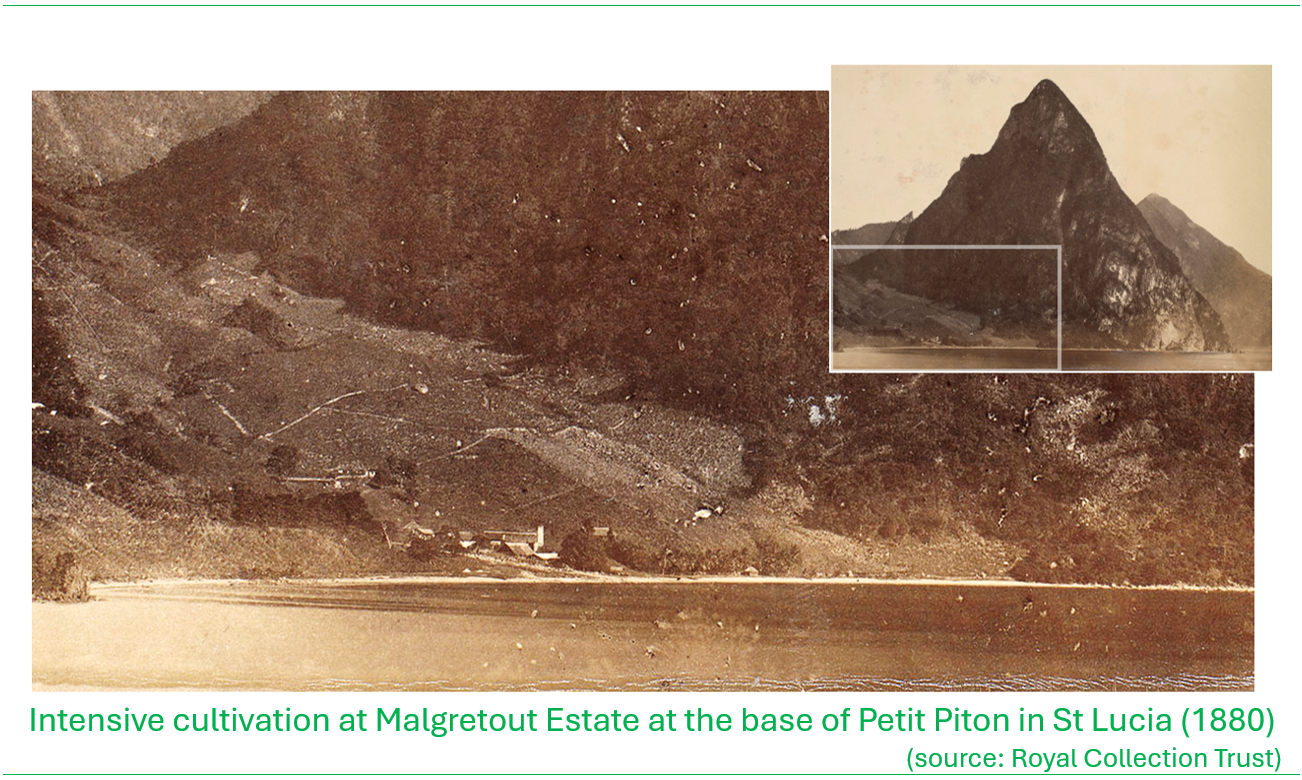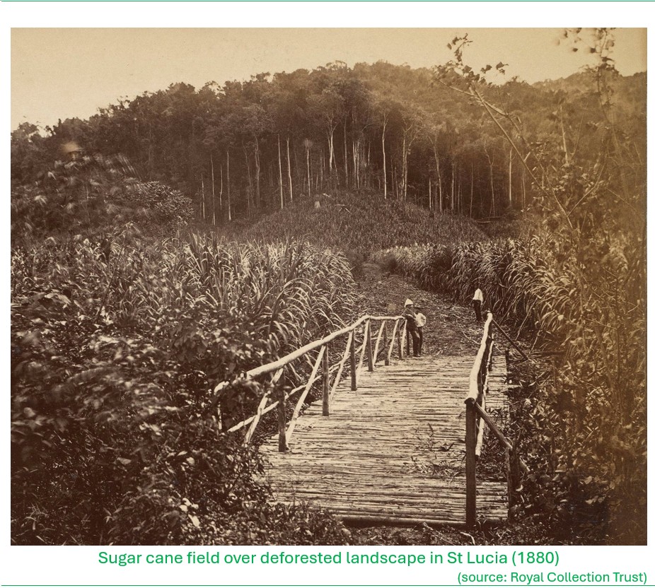 It is known that the landscape of Saint Lucia has undergone significant changes over the centuries since the island was initially colonized. As with all the possessions in the Caribbean in the colonial days, Saint Lucia’s land resources were exploited for the cultivation of sugar cane, through the forced labour atrocities of slavery. The French introduced sugar cane cultivation to Saint Lucia in 1764, expanding the holdings that were already established in neighboring Martinique, triggering the large-scale transformation of the island’s landscapes. The French offered free grants of land to anyone who would come to settle. The first sugar estates were established in the Vieux Fort area, with large plantations gradually taking over most of the flat valleys, including the plains around Vieux Fort, and much of the northern part of the island. By 1775, there were 802 estates. Although sugar cane was the main crop, cotton, tobacco and spices were also grown. In those days Saint Lucia’s forests were already being cut down to export timber to Barbados and Martinique. (BushTalk, Book 1, The Forest and Book 8 People and Places).