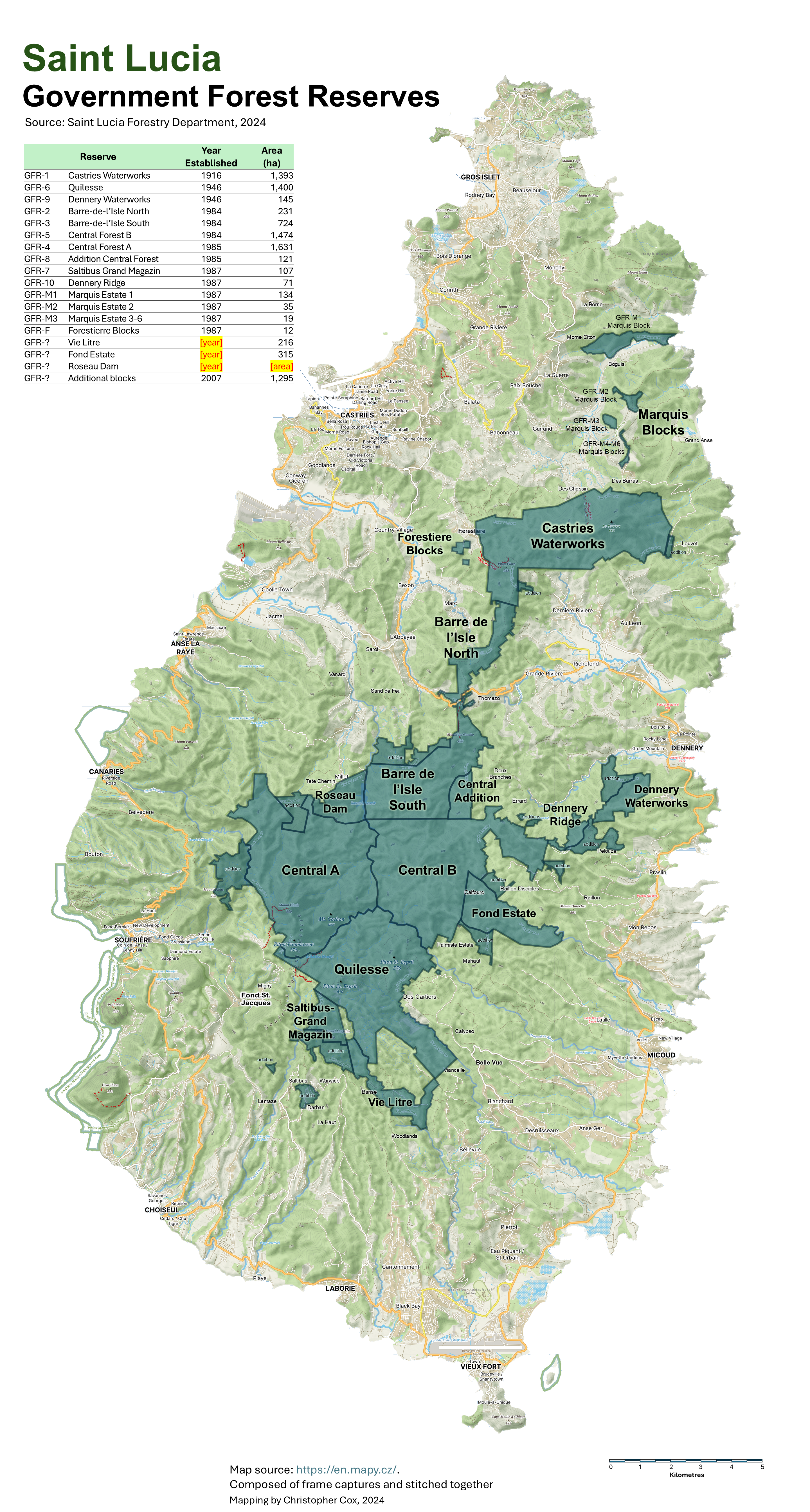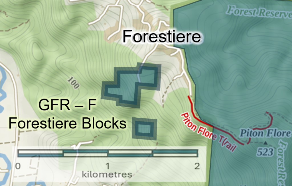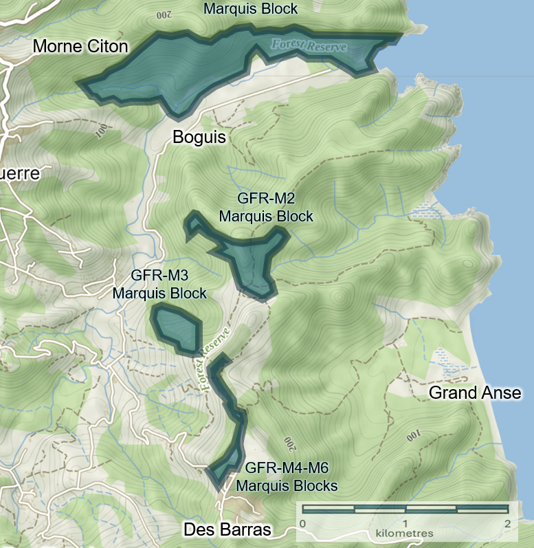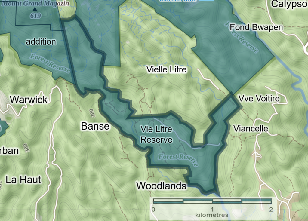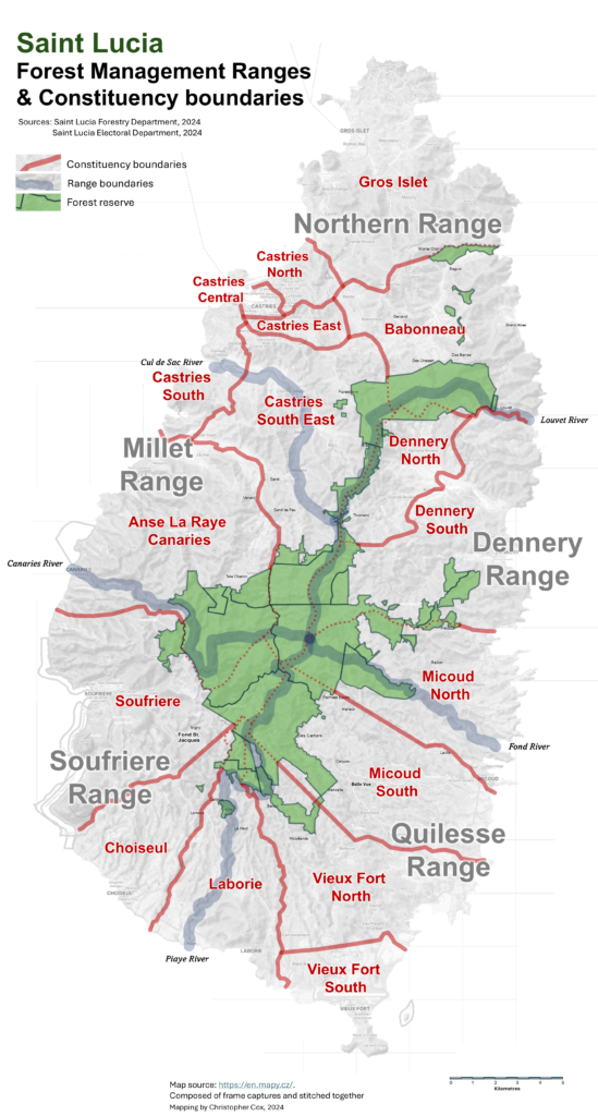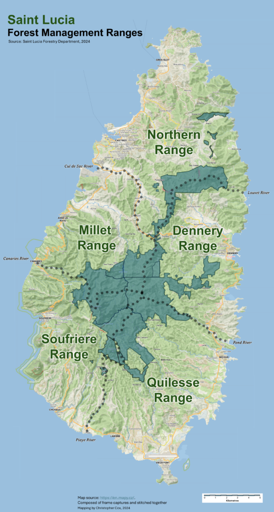 The island’s forest reserves and adjacent landscapes, extending all the way to the coast, are divided into five management units or ‘forest ranges’; (1) Northern Range, (2) Dennery Range, (3) Quilesse Range, (4) Soufriere Range and (5) Millet Range. The work of the Forestry Department is organized within these ranges for purposes of monitoring the health of forests, rivers, and wildlife, and for engagaing with communities within each range to help conserve forest and natural resources.