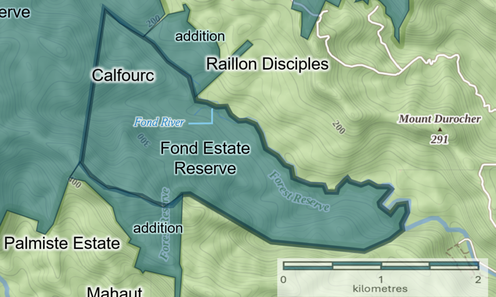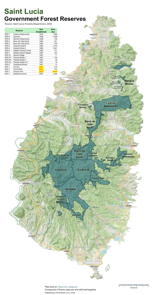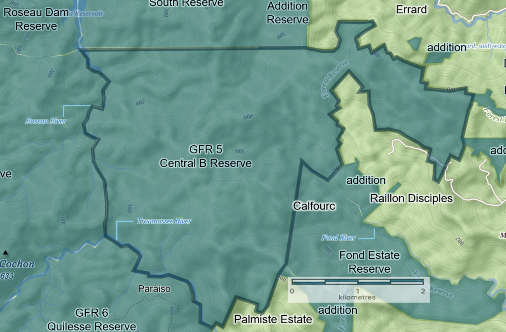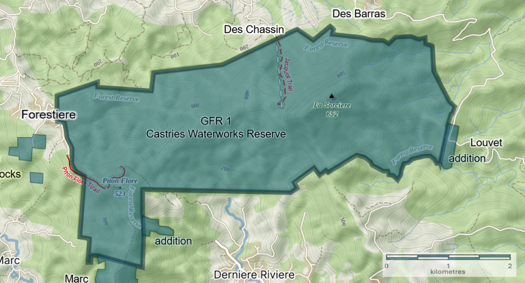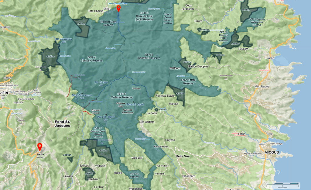 The total area under Government Forest Reserve is 8,028 hectares (19,838 acres), constituting some 13% of the island’s total land area. The establishment of forest reserves in Saint Lucia dates back to 1916 with the establishment of the Castries Waterworks Forest Reserve, designated under Section 4 of the Castries Water Supply Ordinance (Chapter 230) of 1901 relating to designating ‘Gathering Grounds‘ for water. Since then, the other forest reserves were established, commencing in 1946 with the promulgation of the Forest, Soil and Water Conservation Ordinance of that same year.