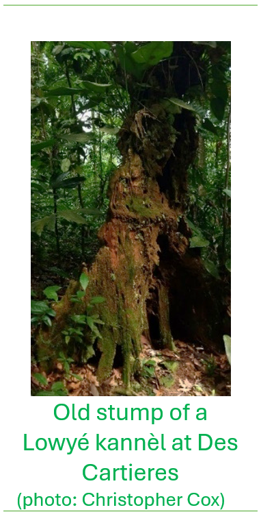 In the case of Lowyé kannèl it was a prized tree for timber on account of its colour, scent and its resilience to rot and termites, and now is perhaps one of the rarest native trees in St Lucia. You would come across stumps of Lowyé kannèl still intact showing that they had withstood the weathering of time and in some cases sadly, the wood was never moved from where the tree was cut, where the harvesters had the intention of coming back to process the timber, but never did. The job was indeed tough, considering the often-steep, inaccessible terrain with no roads. One had to saw the tree into boards and then carry these boards on the sturdy heads of porters to the roadside, usually quite some distance away. What concerned me was that in the face of declining records of these species, assumed to overharvesting, the department was not replanting these valuable local species in spite of them rapidly becoming rare, a fact that was well-known to the forestry colleagues. In the meantime, the department remained focused on planting mahogany and other exotic trees such as Blue Mahoe.