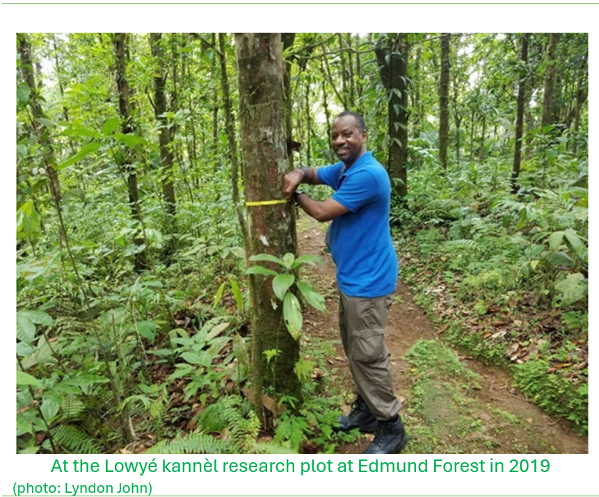 It was under the CIDA forestry project that the Forestry Department set up permanent sample plots (PSPs) in the mahogany and blue mahoe plantations to assess their growth performance, however with little effort at doing similar with native species. By this time, around 1991, when I was Assistant Research Officer, I found myself in an awkward, confrontational position with the Canadian silvicultural advisor who was working with the CIDA forest management project at the time. I proposed the establishment of PSPs for indigenous species including the Lowyé kannèl, however the push-back from the silvicultural advisor was that small research plots would not have yielded statistically significant results and did not see value in their establishment.