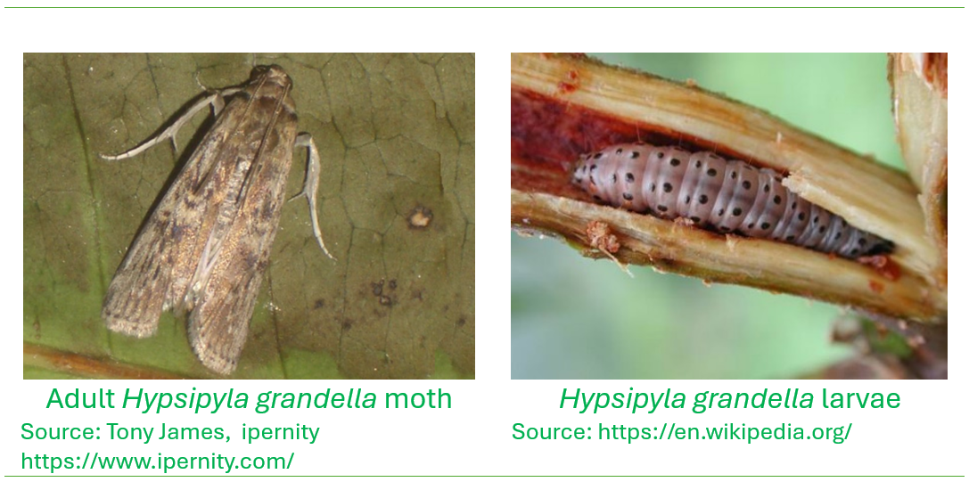 Some of these forest enrichment operations proved difficult to achieve desired results such as in the case of Honduras Mahogany, where the surrounding native vegetation would quickly grow up, overtopping the mahogany seedlings, shading them out and stunting their growth. When the overtopping vegetation was cut back to ‘release’ the mahogany, the exposure to direct sunlight and warmer temperatures, tended to favour attack by the mahogany shoot borer, (Hypsipyla grandella) (the larval stage of the moth) that ate away at the lead shoot that would cause the main stem of the young seedling to branch and grow irregularly, reducing the possibility for the growth of a straight stem that was desirable in a timber tree.