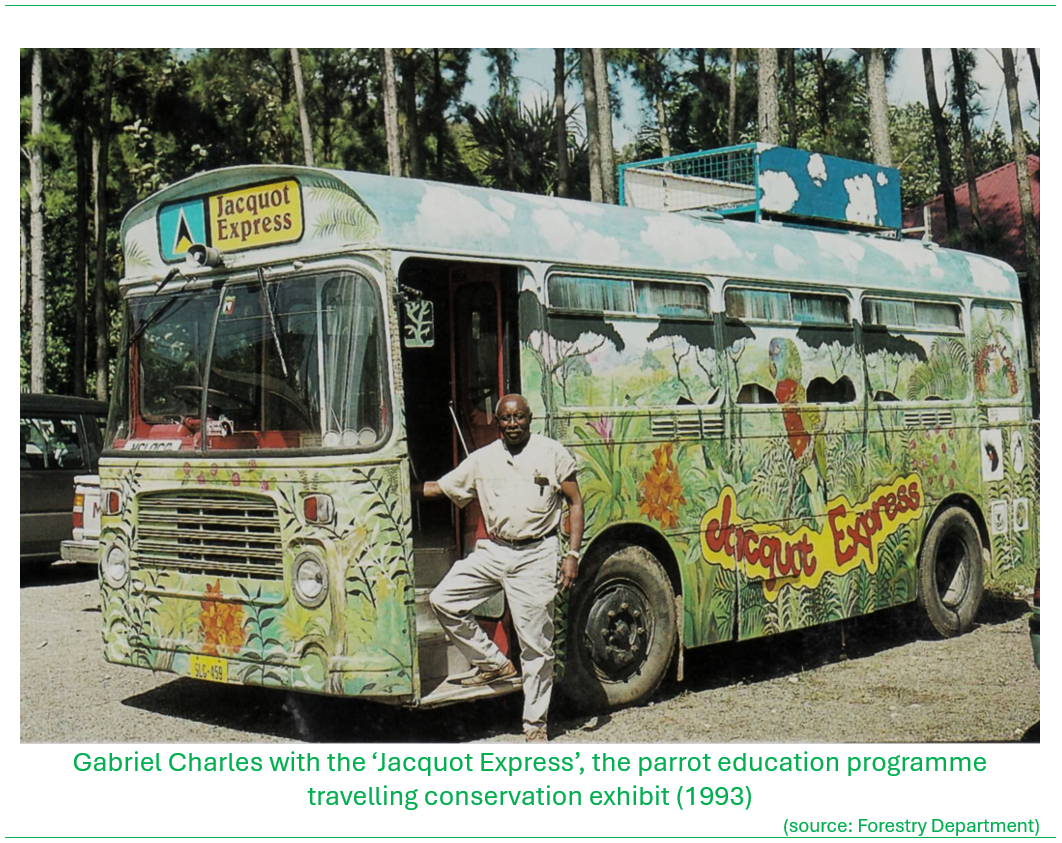 In 1991, the UK-Based World Parrot Trust provided the Saint Lucian division of the RARE Centre (of which Coco Charles was Assistant Director) with a bus dubbed “The Jacquot Express” to help further the Centre’s public education and conservation efforts. As such, the bus was equipped with a portable generator and audio-visual equipment, a PA system and interactive displays.