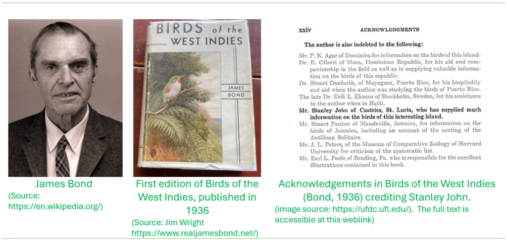 Stanley John is the first noted Saint Lucian who was an avid birder, who contributed extensively to the knowledge of the birds of the island. He worked with the Forestry Division that was at the time headed by William Lang, as a forest ranger with responsibility for areas in the north of the island that included the La Sorcière, Trois Piton and Forestiere areas. His natural interest and keen tracking skills made him highly sought after by visiting ornithologists to the island from the 1920s who contributed pivotal scientific observations on birds of the Caribbean. He assisted the famous American ornithologist James Bond in his field observations of St Lucia birds, accompanying him in his visits to the island in 1927 and 1929. Bond authored the first comprehensive guide to the Birds of the West Indies. Bond served as a curator of the Academy of Natural Sciences of Philadelphia.