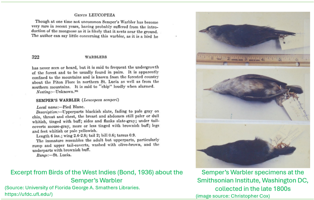 Stanley learned the craft of taxidermy to preserve bird specimens, his skill apparently acquired from James Bond and earned diploma certification in the field. At the time he was the only taxidermist on the island. He is associated with being the last person who convincingly saw the Semper’s Warbler, a bird that is found only on Saint Lucia, named after Reverend John E. Semper, who was the Colonial Chaplain of the island (Danforth, 1935) and an amateur ornithologist in the latter part of the 1800s. Stanley collected a specimen of the Semper’s Warbler in 1934, and despite searching extensively for the bird since then, he did not encounter it again until 21 May 1961 at Louvet, near the east coast of the island (Weidensaul, 2022). Although there have been reported sightings of the bird since then, none of these have been conclusive and the bird is feared to be possibly extinct, although there could be a small chance that it still inhabits the undergrowth in forests deep in the island’s interior.